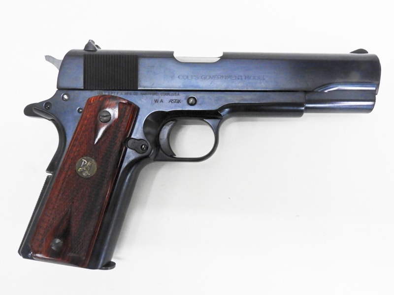 コルトMKIVシリーズ70刻印。木製グリップ装着&金属製グリップ付きでHW、ブルーイングが施された一品。