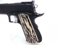 独創的ながらも、その実、王道のコンバットカスタムとして構成されたミルズカスタム。スライド&バレルには、射撃の際、マズルの跳ね上がりを押さえる大型のエクゾーストポートが設けられた他、バレル自身もコーンタイプにシェイプされ、スライドスピードを向上させています。そのほか、操作部が大きく延長されたスライドストップ&アンビセフティ/着弾にあわせて微調整が可能なボーマータイプリアサイト/ハイグリップで安定した射撃をサポートするビーバーテイルグリップセフティ、等々…実に多様なカスタムパーツが装着されました。トレードマークであるスタッグホーン(雄鹿の角)製グリップは、樹脂で成型されたのち