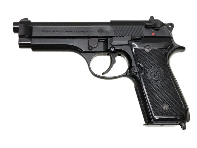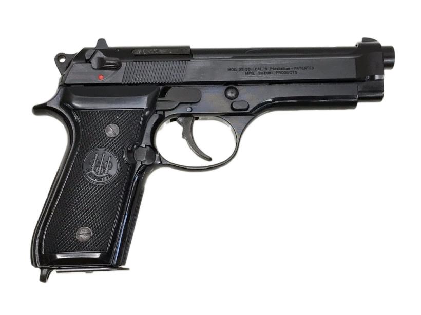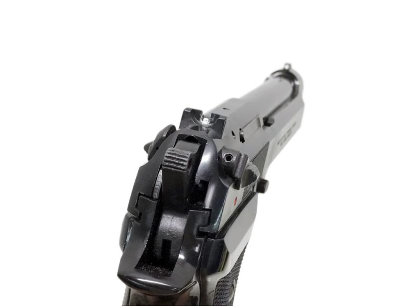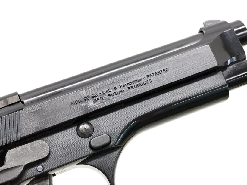 希少なSBモデル。ベレッタM92最初のモデルである92から、セフティやマガジンキャッチの位置などに改良が加えられたモデル。現在ではSBモデルのモデルガンの製造は行われておらず希少な一丁。ヘアラインの入った高級仕様。