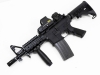 通常のM4と比べてショートバレルとなった以外はほぼ何も変わっていないのに、何故か全体にスケールダウンしたかのように見える不思議なサイジング。持ってみると前が短い分ウェイトが中心寄りになっており、単純な大きさ以上に取り回しが良く感じる。動作に関してはノーマルM4と変わらない強烈なリコイルが楽しめるが、ショートバレルでマズルが身体に近い分、発射音なども近くで聞こえるために迫力が増している感がある。