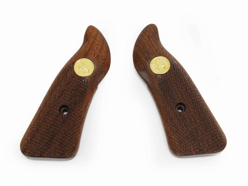 コルト・キングコブラ用木製グリップ。チェッカー、メダル入り、サービスサイズ。裏には若干のスレがありますが表面はかなりきれいな状態です。