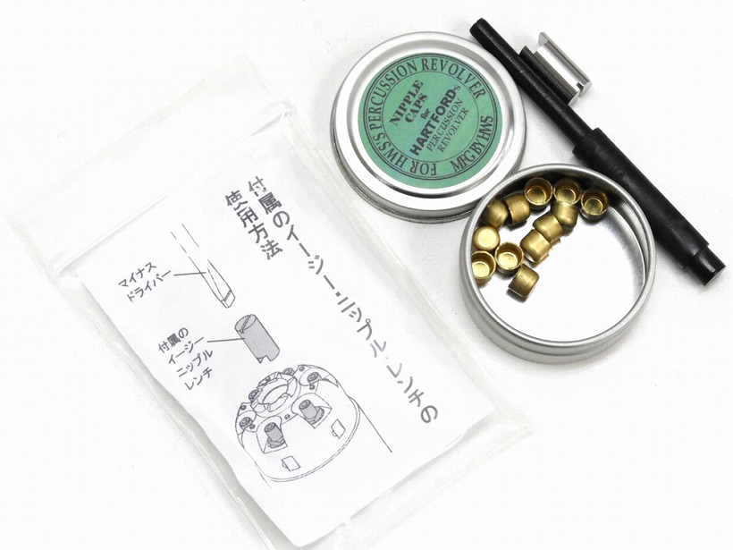 木製グリップ標準装備。アンティーク調缶入りニップルキャップ12個付属。