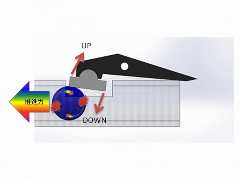 放たれたBB弾は通常の推進力が切れた後も10mほど落ちずに「飛翔」。2段階の力で飛距離を稼ぐ。