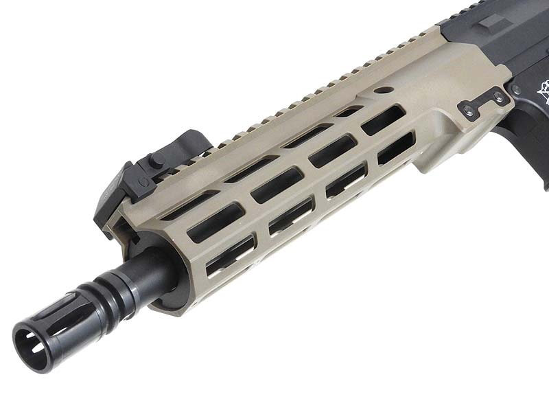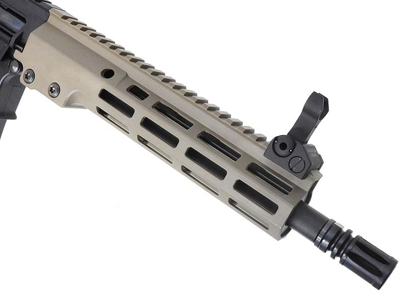 ハンドガードはSMR MK16タイプのM-LOKスロットを備えたレールハンドガードが装着されており、リトラクタブルストックと組合わせることで取り回しのし易さを確保しながらもバランス良く仕上がっております。