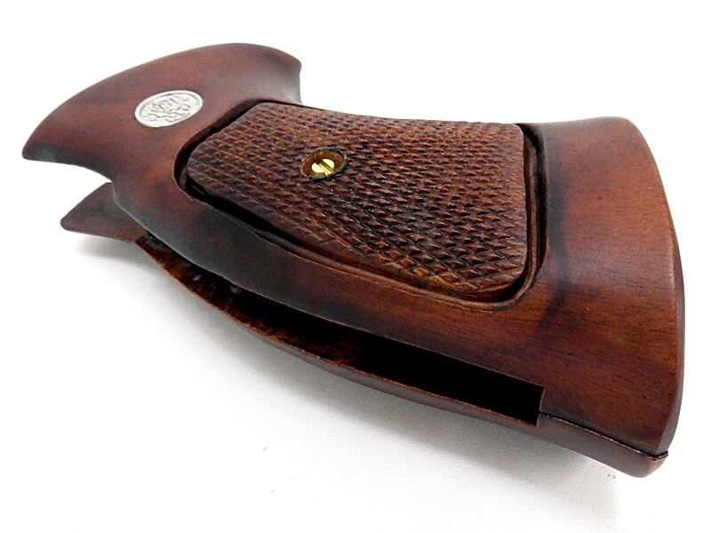 ハンドメイドでS&W純正の形状を丁寧に再現したフルカバータイプKフレーム用グリップ。非常に貴重なチョコレートのような色合いのマホガニー材を使用した贅沢な品。