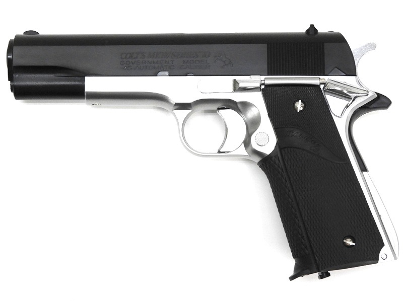 マルゼン製のコルトガバメントで、シルバーとブラックのツートンカラーが美しい。