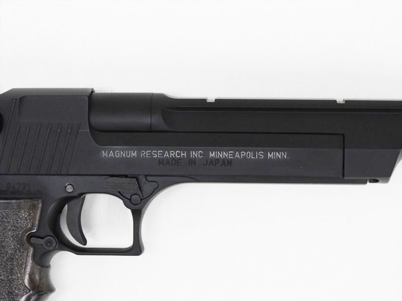 通常の倍以上に火薬量を増強した強装弾薬=マグナム弾は、従来は「ライフル用」もしくは「リボルバー用」として…が前提だった。しかし、M16などの軍用ライフルに見られるロータリー・ボルトの機構を応用する事によって、オートマチック・ハンドガンからマグナム弾を撃ち出す試みも、アメリカでは'70年代から盛んに行なわれてきた。“.44オートマグ”や“ウィルディ”などがその有名な例だが、多くは製造メイカーが弱小であったり、製品そのものが“試作品”の域を出ず、一部コレクターを喜ばせるに留まったのである。…たった一つの“例外”を除いては…!その“例外”こそ、かつて名銃“UZI‐SMG”を生んだ軍用銃の名門IMI(=イスラエル・ミリタリー・インダストリー/イスラエル軍兵器工廠)が開発したマグナムオート〈デザートイーグル〉だ。当初は“.357マグナム”のみだった口径も、1980年代中盤からアメリカでマグナムリサーチ社が製造&販売を手掛けるようになってからは、“.44マグナム”“.50AE(=口径50アクション・エクスプレス弾)”が加わって、計3種のバリエーションとなった。特にこの“.50AE”は、標的への打撃力に於いて“.357マグナム”のおよそ3倍!あの“.44マグナム”のおよそ2倍!! と圧倒的なパワーを有する、文字どおり『世界最高』クラスのハンドガンなのである。