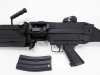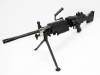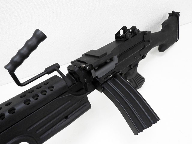 外観はフルメタルでTOP製のミニミにも負けない重厚な造り。詳細に比べるとメカ部分やHOPの性能は国内産の電動ガンに軍配が上がるが、このミニミの雰囲気を味わうには十分おすすめできる一品。SAW(分隊支援火器)の決定版。歩兵120人分の火力を持つといわれ、5.56の弾薬を使用するため、M16などのマガジンも使用できる。装填数2500発のBOXMAGAZINEは別売りとなります。