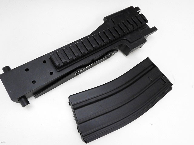 付属多弾数マガジンとフィードレイルカバー。マウントレイルがついていて便利。