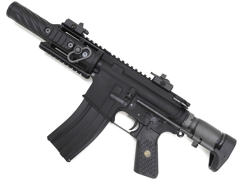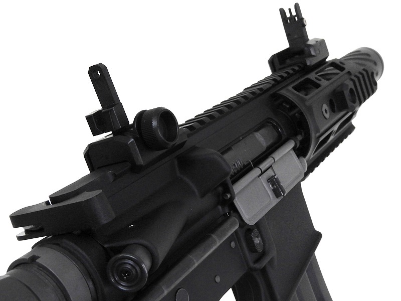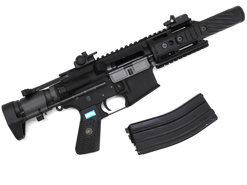 WE-Tech社がH&K HK416Cをベースに製造したカスタムガン。全体にコンパクトにまとめられており、デフォルトで装備されたサイレンサーが印象的です。レシーバーには45度ごとの各面にレールを装着することができます。