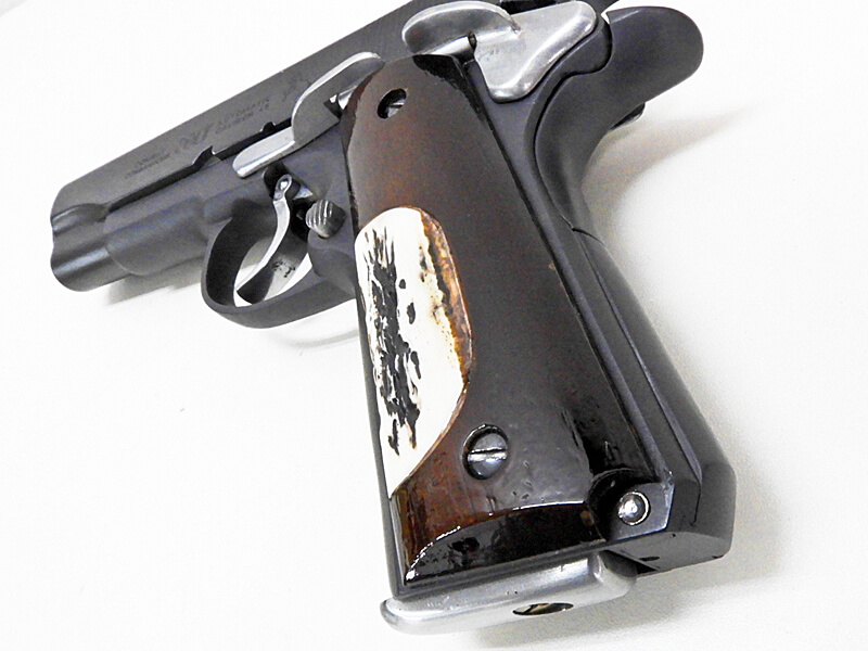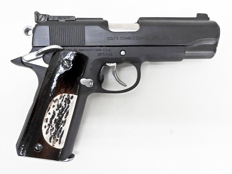 ハンドメイドのスタッグ&ウオールナットグリップを装備した固定スライド方式のWA製コルト コンバット・コマンダー。弾道は訳あり。