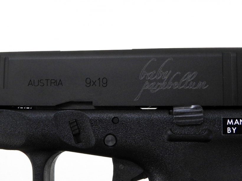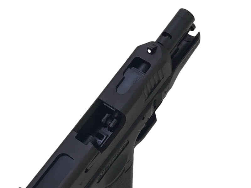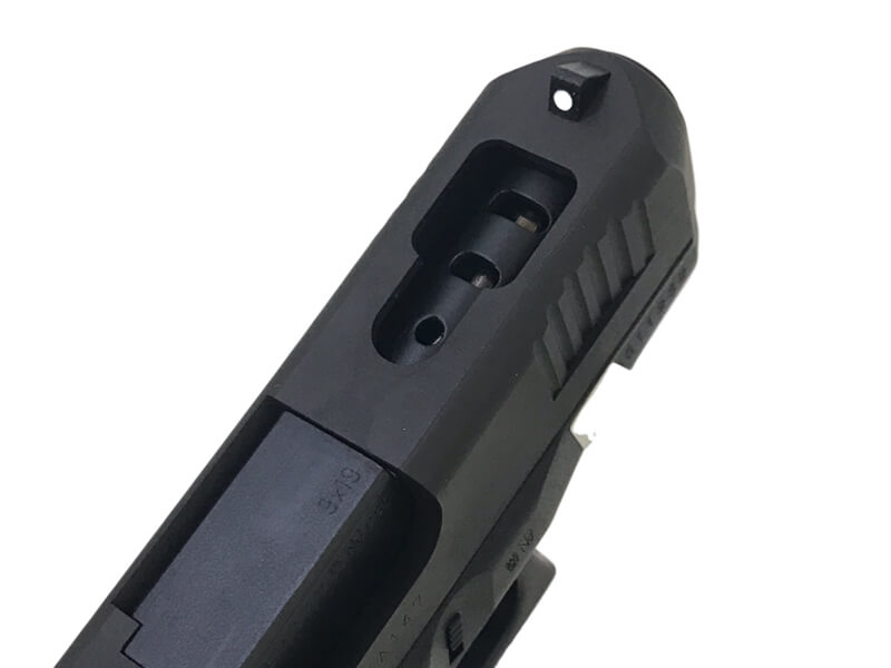 小型のスライドに合わせて凹型のセレーションや軽量なアロテック型リアサイト、マシンガンフリークを意識したムード抜群の刻印などを追加。