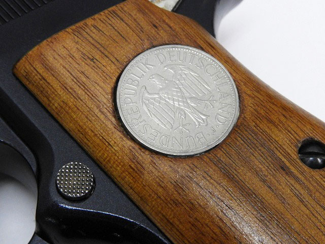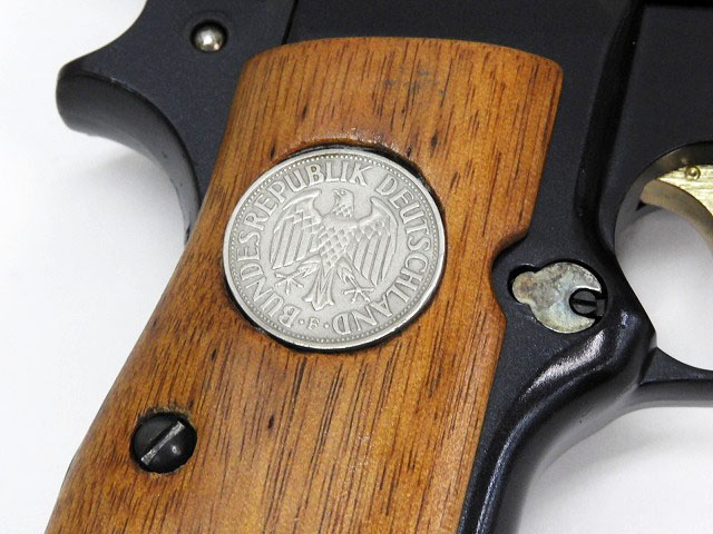 木製グリップパネルに「Deutschland Bundesrepublik」(ドイツ連邦共和国=西ドイツ)と記された大型のメダルが組み込まれたカスタム品。個人制作パーツと思われますが詳細は不明です。