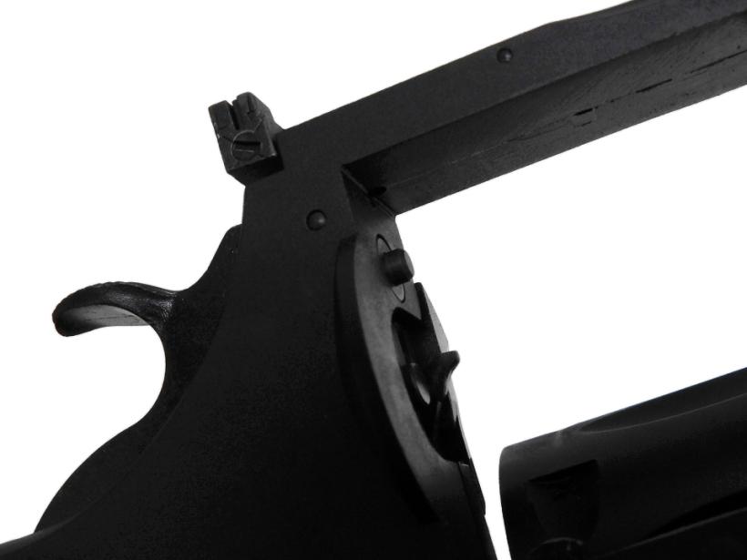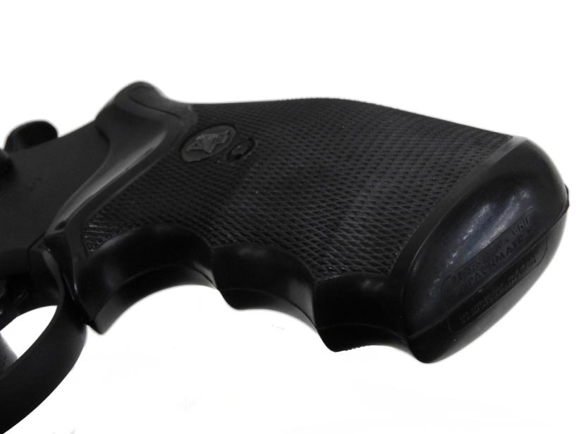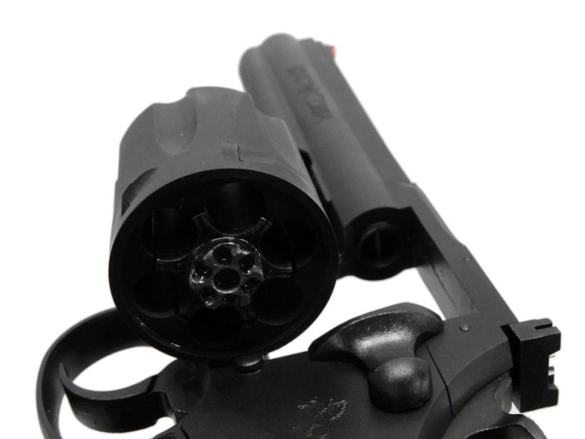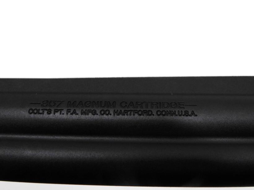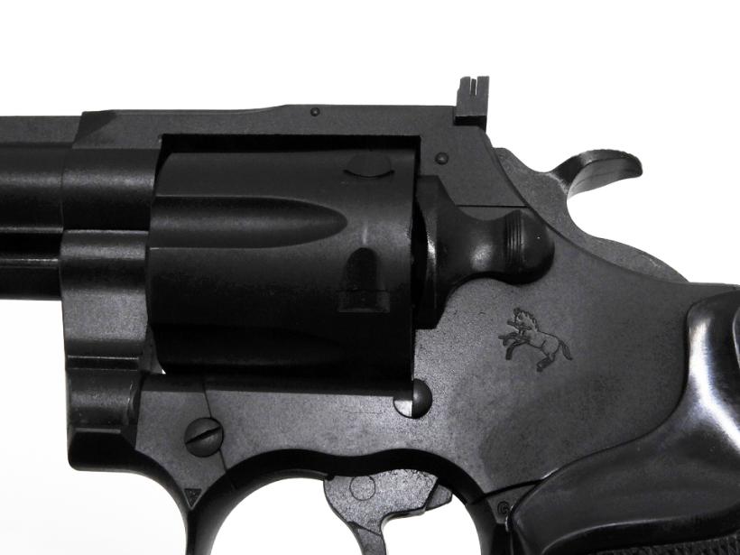 トリガーメカやグリップが改良されたマークVリボルバーに、スタビライザー効果抜群のフルバレルシュラウドを装備する357マグナムの完成型がこのモデル。80年代のメーカー純正品としては珍しいダークテイストの刻印が強烈なキャラクターを主張している。4インチモデル。