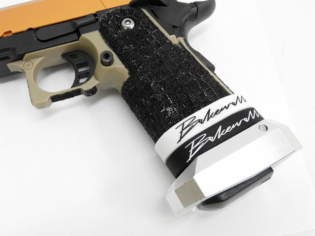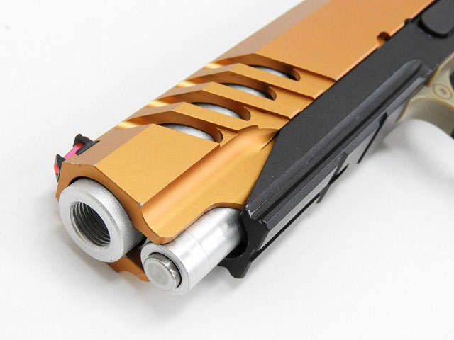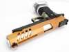 東京マルイ ハイキャパベースカスタム。オレンジに映えるスライドやカスタムグリップが特徴的なオンリーワンのカスタム品。