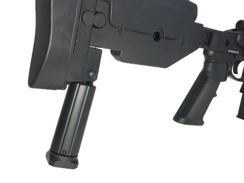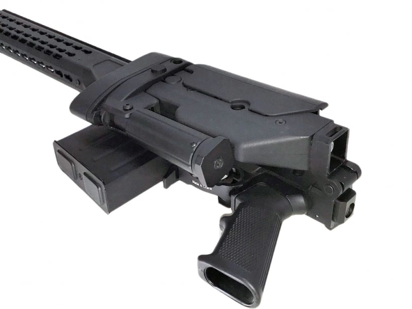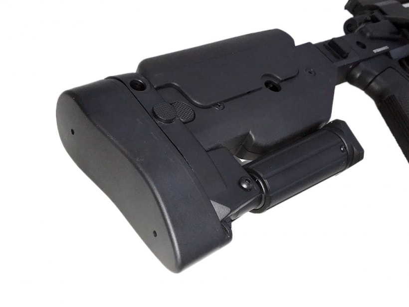アルミ製、レイルはCNC切削出し。4面レイルが配されたハンドガード、チークライザー・バックストック・モノポッドグリップを備えたフォールディングストックなどを備え、機能性の高い仕上がり。