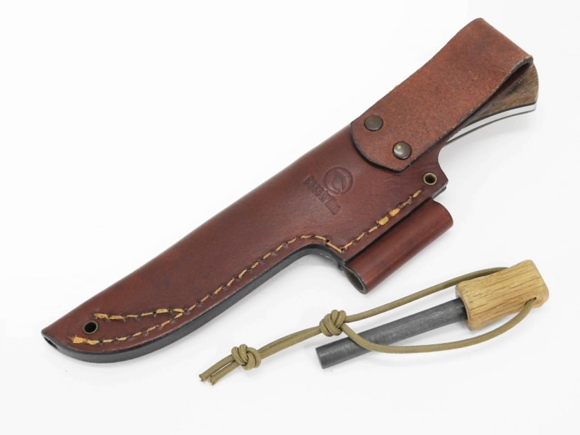 環境意識を第一にした製品作りをモットーにするカストロムのシースナイフ。4mm厚のブレードでフルタングのがっしりとした構造です。ファイアスティールが付属して火も起こせる実用的なアウトドアナイフ。