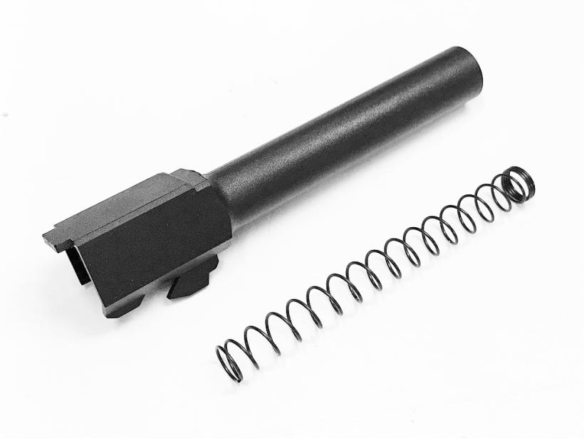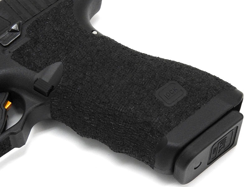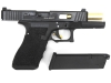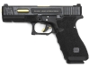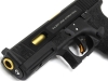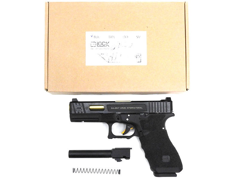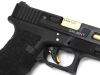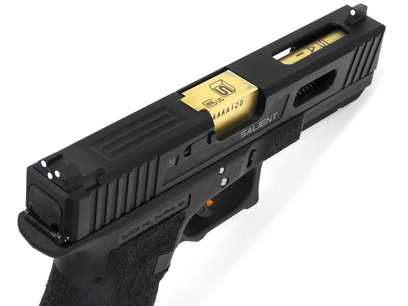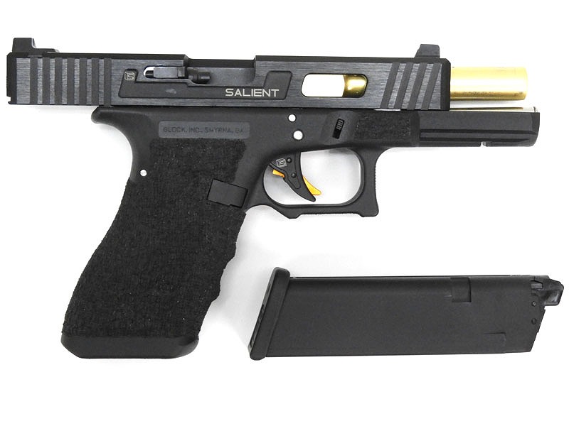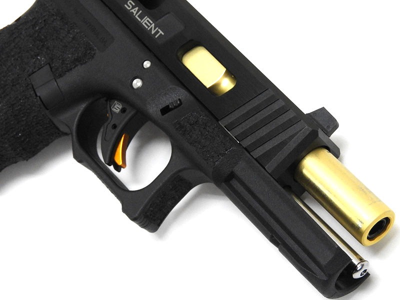 ステッピング加工のフレーム、大きく肉抜きされ、黒く光沢のあるスライド、フラットトリガー、ゴールドアウターバレル。スライドはクッキリとしたロゴと文字のレーザー刻印、深々と刻まれたセレーション。異彩を放つG17SAIカスタム登場。スライド、アウターバレルはもちろんメタル製。ノーマルのアウターバレルも付属。