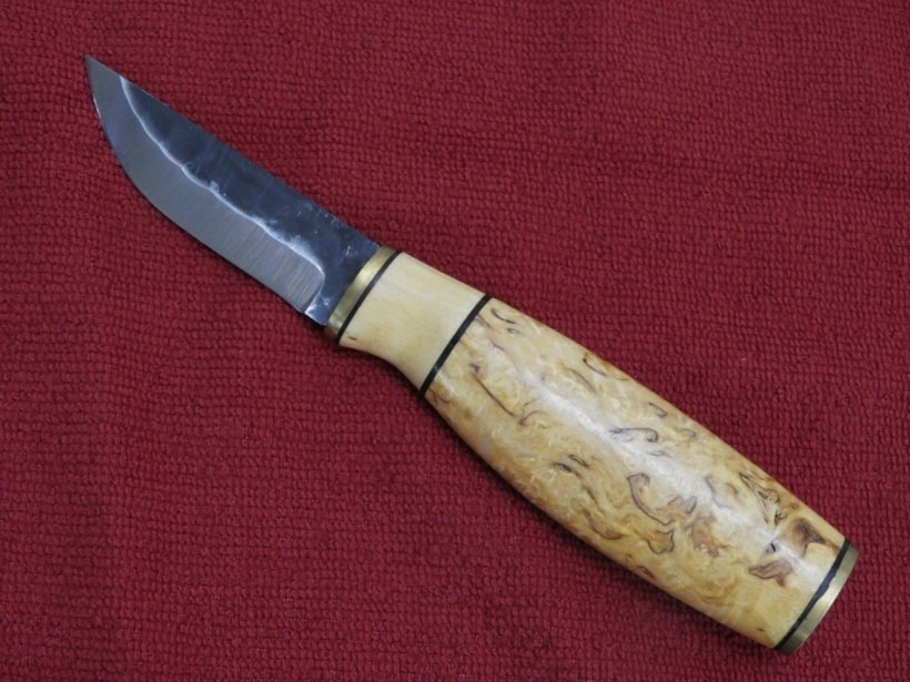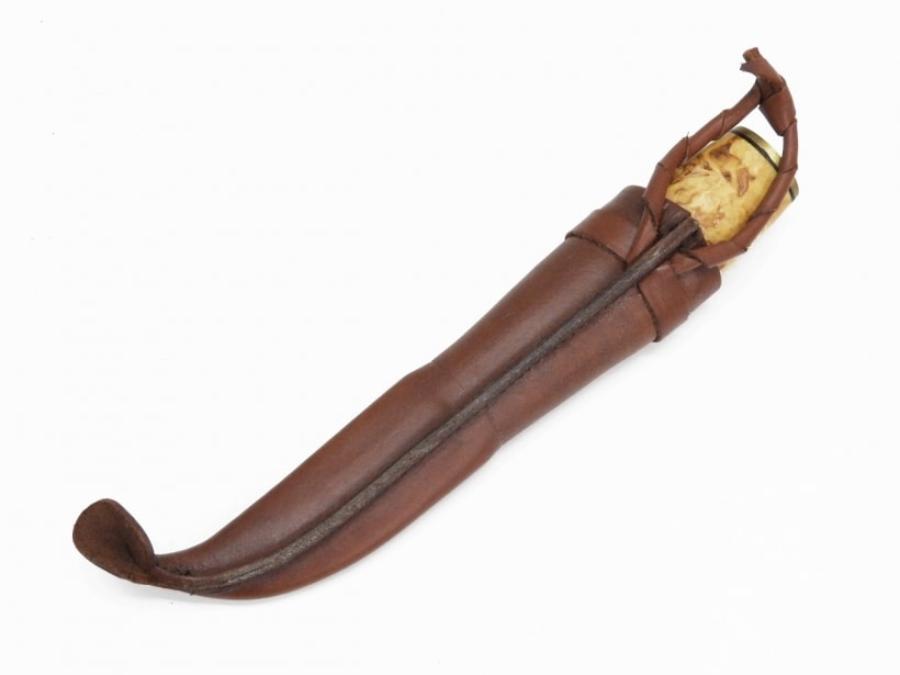 フィンランド伝統の「Puukko(プーッコ)」スタイルのナイフ。ポーラー77は77ミリのブレードで、柄材には木目が美しいカーリーバーチを使用。本革製のシースは伝統的な意匠が凝らされ、ナイフに心地よくフィットする。