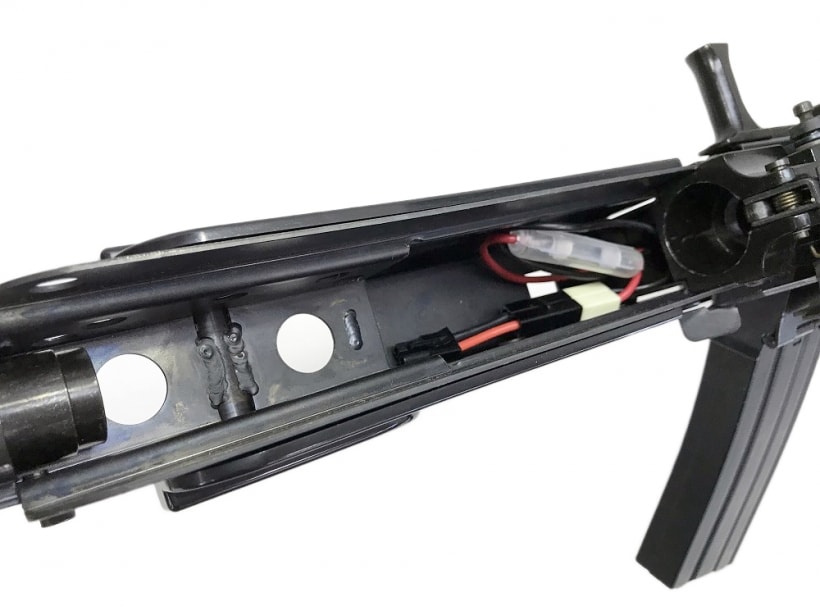 動作には別売の専用9.6Vバッテリーを推奨されているが、ラージへの変換コネクタがあればマルイの8.4VミニSでも問題なく動作可能。