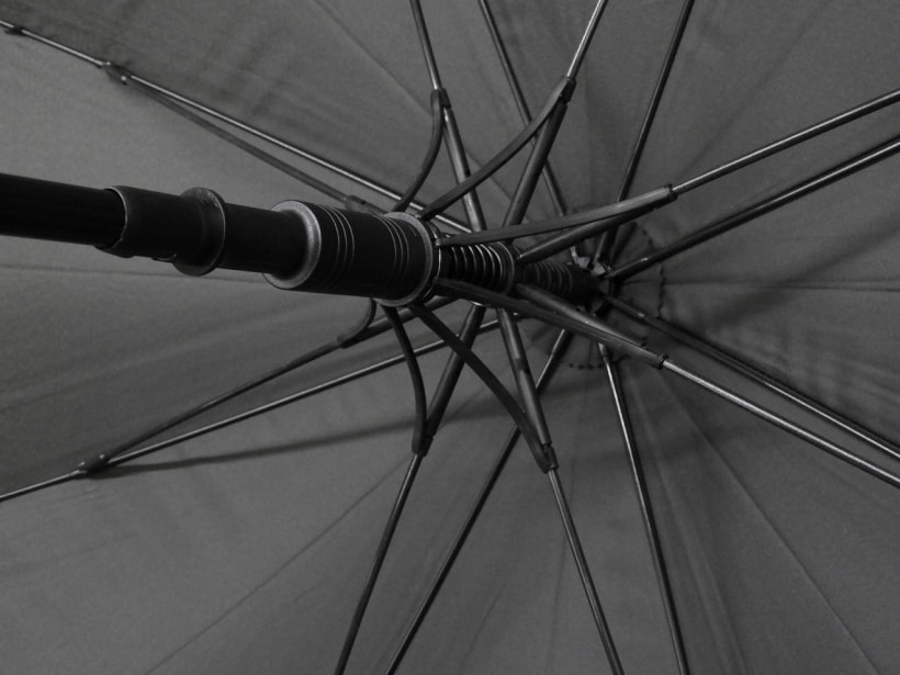 GLOCKのポリマーフレームを思わせるしなやかなプラスチック製の受骨で全体は極めて軽量。開く時は柄のシルバーのスイッチを押すことでスッと開き、無粋なストッパーなしで自然に止まります。閉じる時も「カチッ」と小気味よい音を立ててスムーズかつ確実に閉じます。