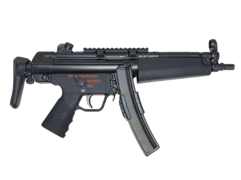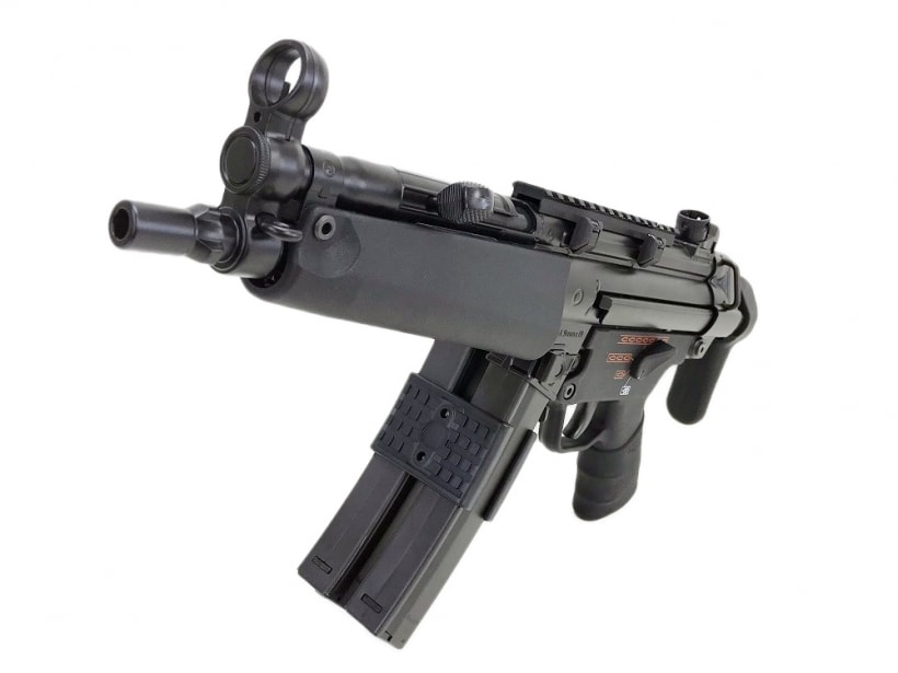 「次世代電動ガン MP5A5」の重量は3.1kg、実銃と変わらない重さとなっている。実銃採寸により、デザインなども可能な限り再現。アッパーフレームは亜鉛ダイキャスト。ハンドガード、ロアフレーム、バッドプレート、セレクター、コッキングハンドルは、強化ナイロン樹脂。