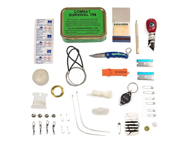 ・ブリキ製防水ケース ・折りたたみナイフ ・飲料水用の滅菌剤タブレット10個 ・釣り針 ・つり道具 ・ホイッスル ・マッチ ・安全ピン ・ソーイングセット ・ファイヤースチール ・ロウソク ・鉛筆い ・ワイヤーソー ・スネアワイヤー(罠用はりがね) ・カミソリ ・ナイロンコード ・タイラップ(結束バンド) ・シリコンチューブ ・LEDライト