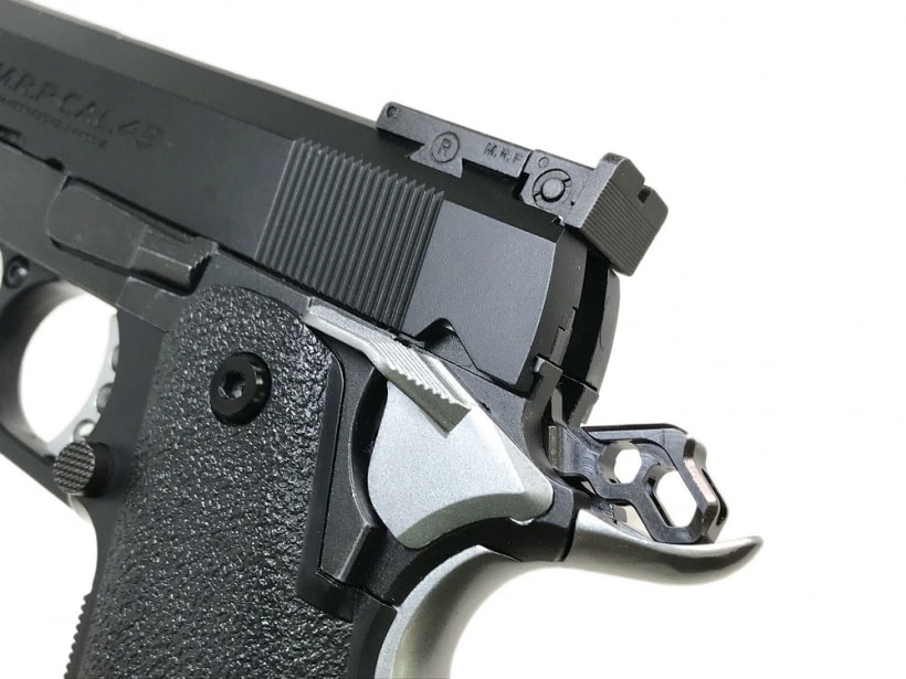 セミワイドサイズのサムセフティを左右両側に設置し、持ち手を選ばない実践向けスタイルとなっています。