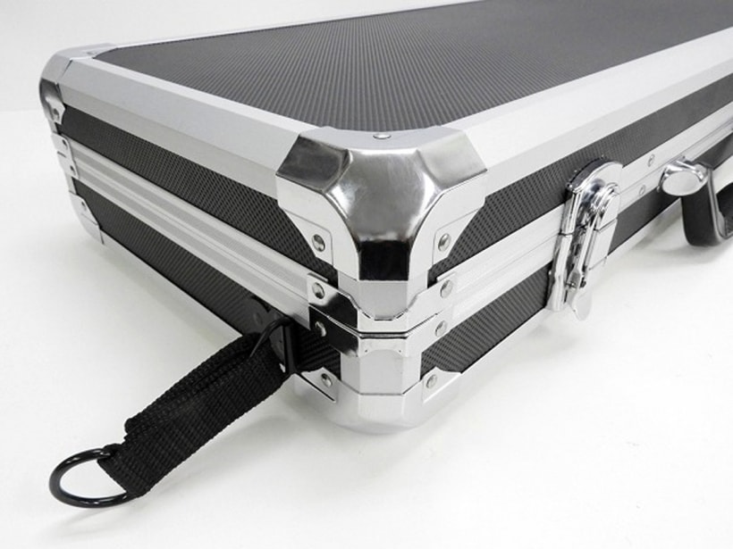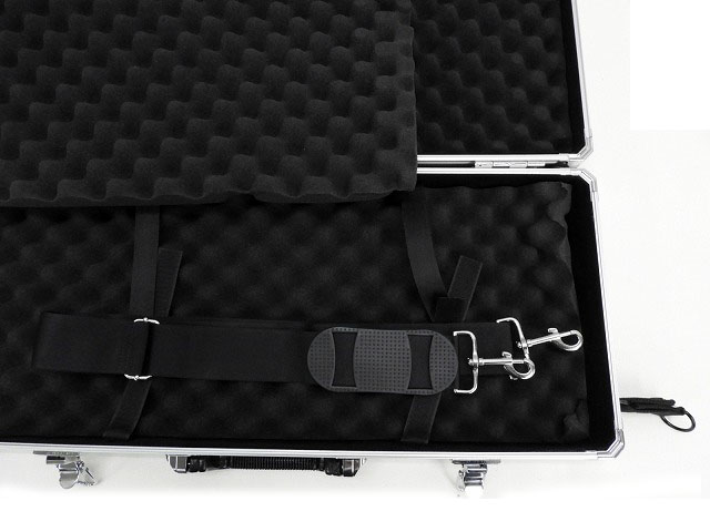 ショルダー付きのハードガンケースアタッシュ型65サイズ。ブラック/シルバーフレーム。