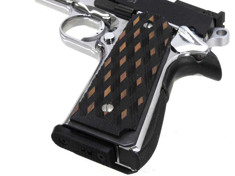 クロームメッキが施された艶かしいフレーム&ツヤのあるブラック・スライドをベースに、ラージホールリングハンマーや、チェッカータイプのアーチ型メインスプリングハウジング、削り出しワイドトリガーシューやアドバンスドグリップシステムといった往年の名カスタムパーツを完全搭載!!クラークボーリングピンモデルを彷彿とさせるメタルシート入りのグリップや、独特のパターンの木製グリップが昔懐かしい時代のコンバットカスタムを思い出させくれる一品。