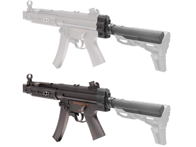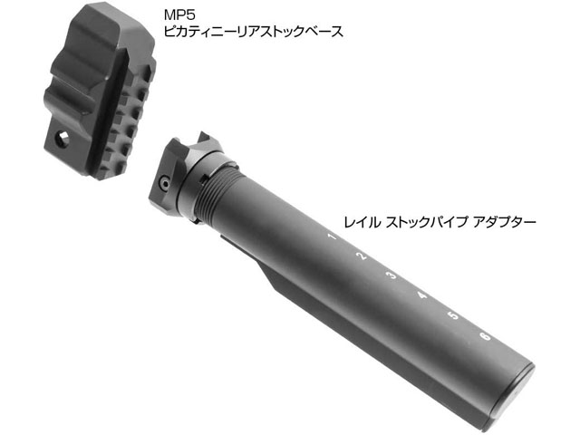 MP5 ピカティニーリアストックベース+レイルストックパイプアダプターのセットで、東京マルイ MP5シリーズ電動ガンにM4系のストックを取り付ける為のストックベースセットです。