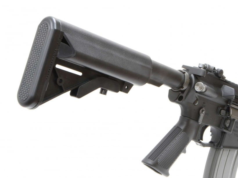 アメリカ軍特殊部隊用に様々な装備を開発してきたナイツ・アーマメント社のM16、それがストーナーズ・ライフル「SRシリーズ」。7.62mm×51弾を使用するナイツ社のM16・SR-25に対し、5.56mm×45弾を使用するSR-16は、コルト社のM4A1カービンに相当するモデルと言える。素材の選定からパーツ精度までこだわりぬいて作られたSR-16は、コルト社の通常軍用モデルとは一線を画する仕上がりで、特殊部隊の精鋭達から尊敬と畏怖をこめて「ブラックナイツ(=黒騎士)」と呼ばれているという。