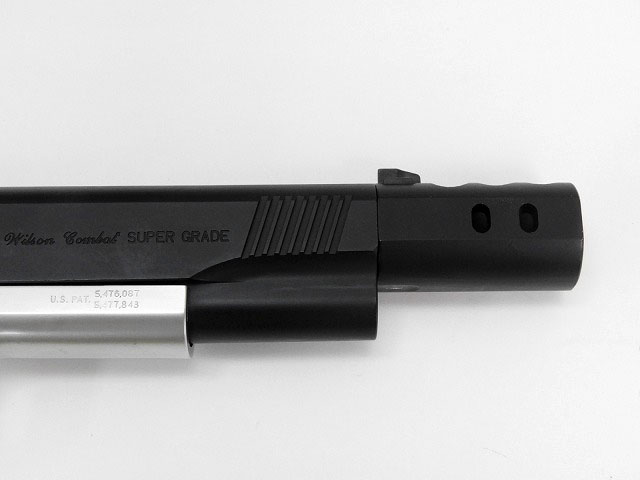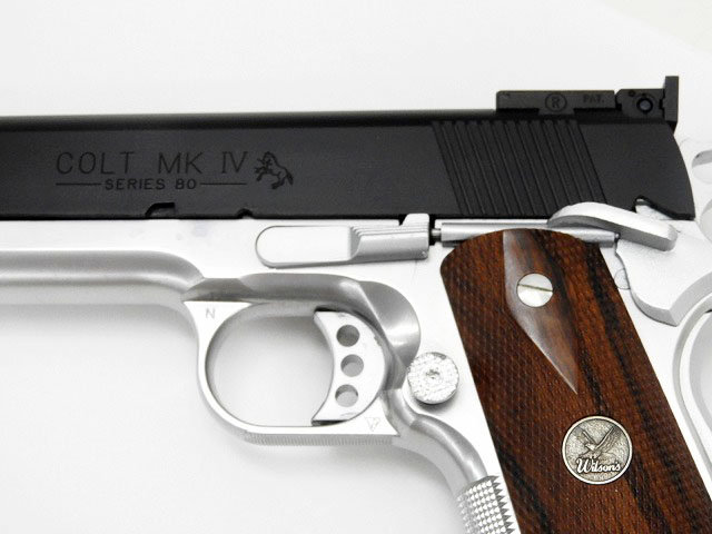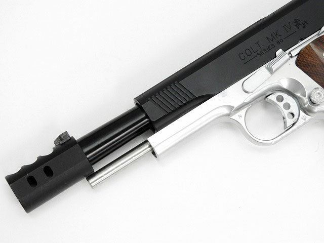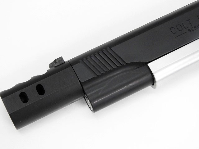 コルトガバメントをベースとし、より早くより正確にターゲットをとらえるために誕生した「コンバットカスタム」。フレームシルバー。コンペンセイターがついたモデル。