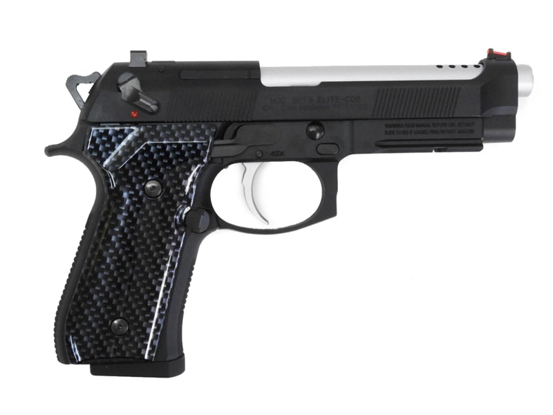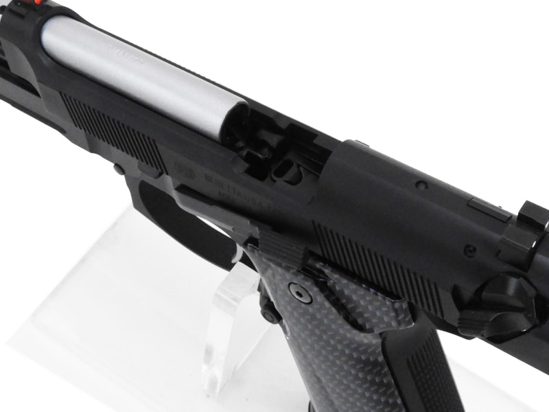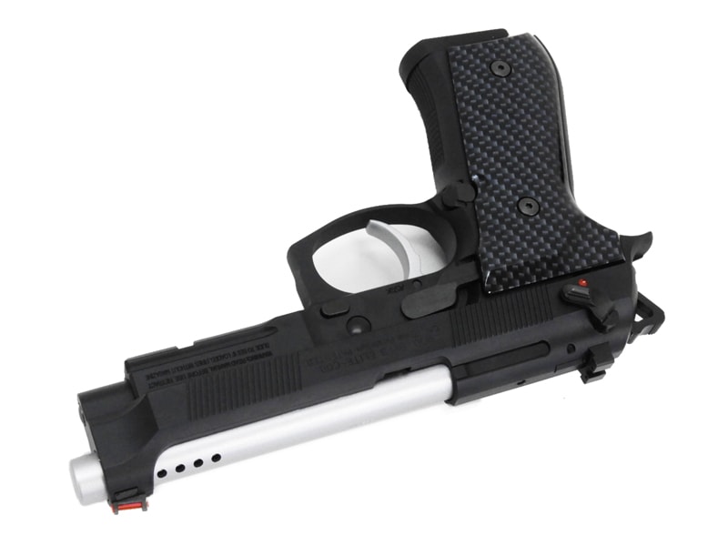 左右のグリップパネルには、ベレッタM92ビレニウムに採用されたカーボンファイバータイプを彷彿とさせる新型ポリマーグリップがあしらわれておりアグレッシブな存在感を放ちます。