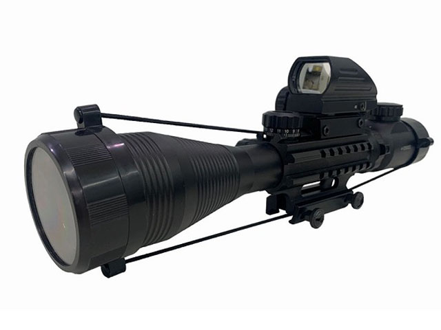 4-12x50 イルミネーションスコープ マウントベース/リフレックスタイプ レティクル4ダットサイト付。全長約33cm。
