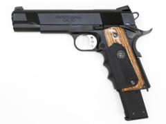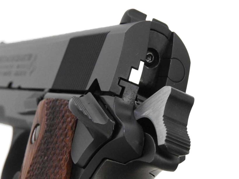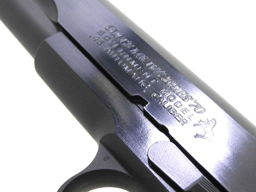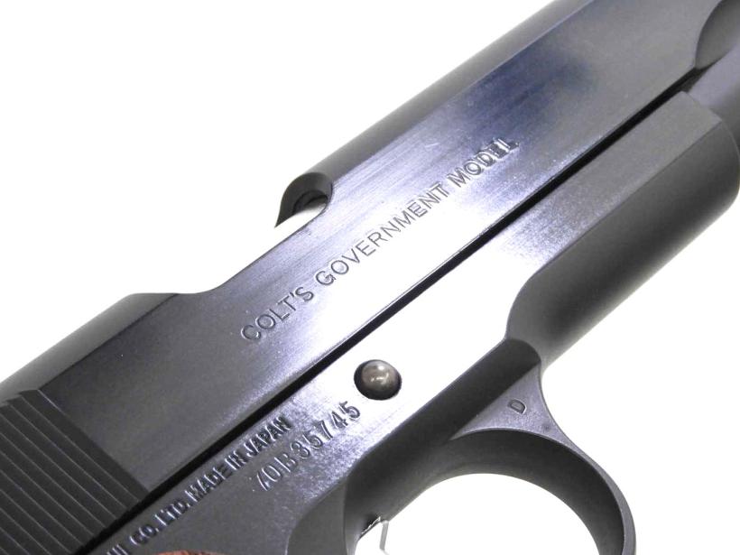 東京マルイのコルト ガバメント マーク4 シリーズ70 をベースにグリップをはじめ、バレル、トリガー、ブリーチ、バルブまで10種類を超えるパーツを組み込んだカスタム品。