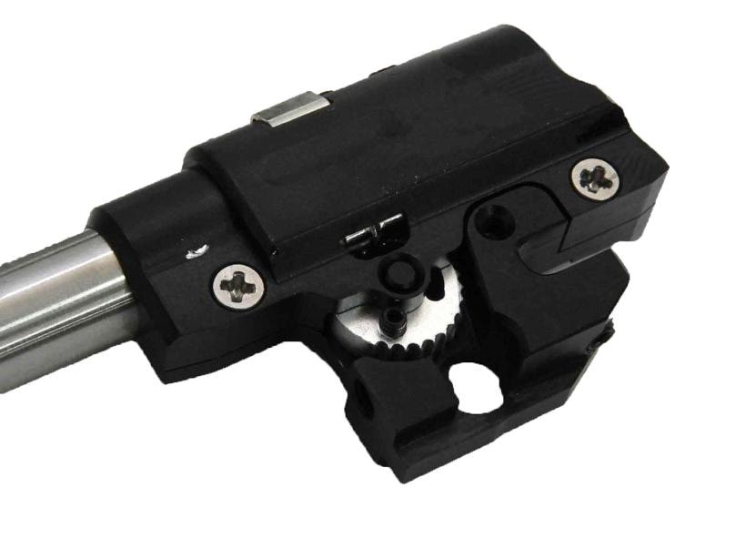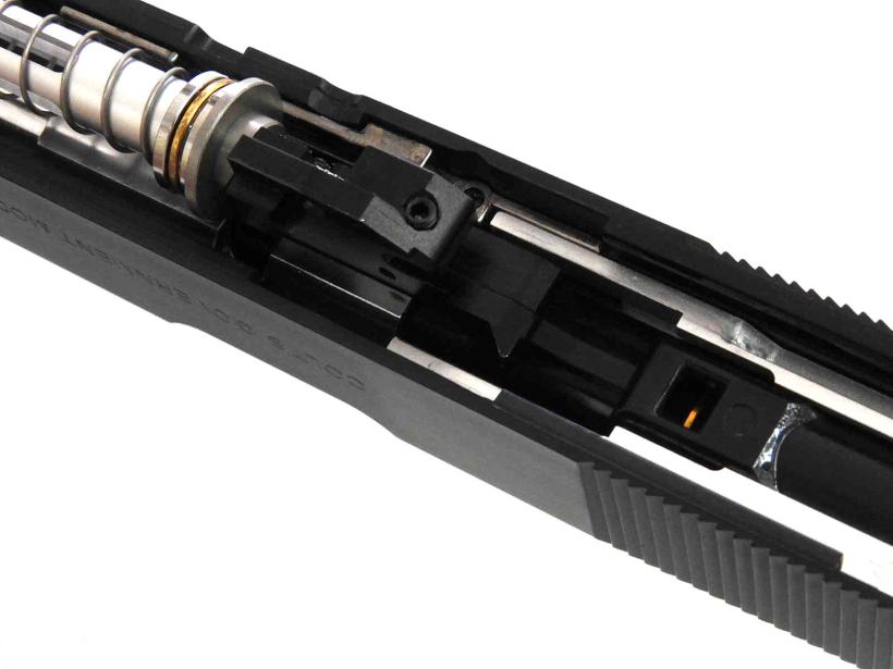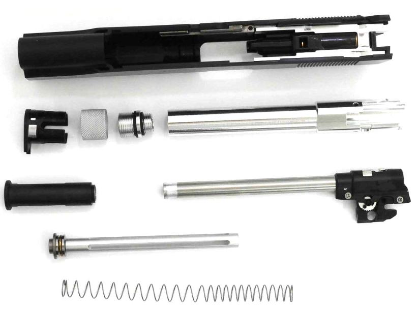 また、ブリーチブロックとスプリングガイドロッドは軽量なものに交換済みで、バレルのティルトをオミットしてあるため、ブローバックスピードが向上しています。ホップ調整ダイヤルもイモネジで固定できるL3機構搭載なのでブローバックの振動でプリセットが崩れたりしないのもうれしいポイントです。