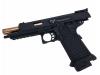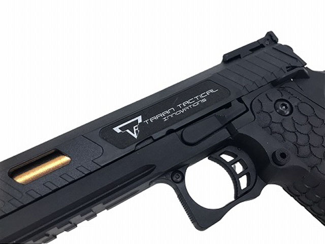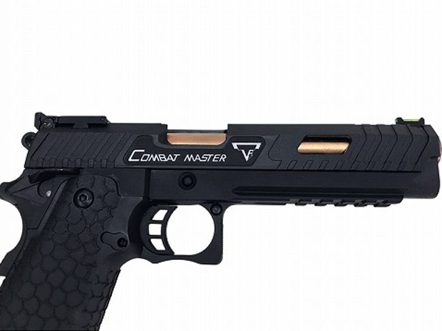 日本の法規制に適合した強化樹脂スライドは、ブロンズ仕上げのアウターバレルがのぞく両側面のポートを始め、実銃の実践的なデザインを忠実に再現。