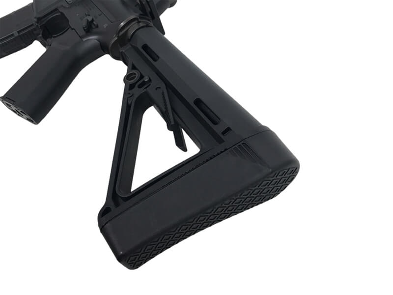 ストックは現在絶大な支持を得ているスケルトンタイプストックのデザインを採用しつつも、後部バットプレート内部が小物入れとなっており、予備バッテリーなどを収納可能という使い勝手の良いデザインとなっている。