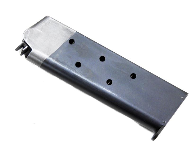 マガジン:先端の窒化処理を再現したツートーンの仕上げになっている。フロアプレートはピンで止められており、実はマガジンも設計を見直し修正、。スムーズな着脱と確実なスライドストップを可能にしています。