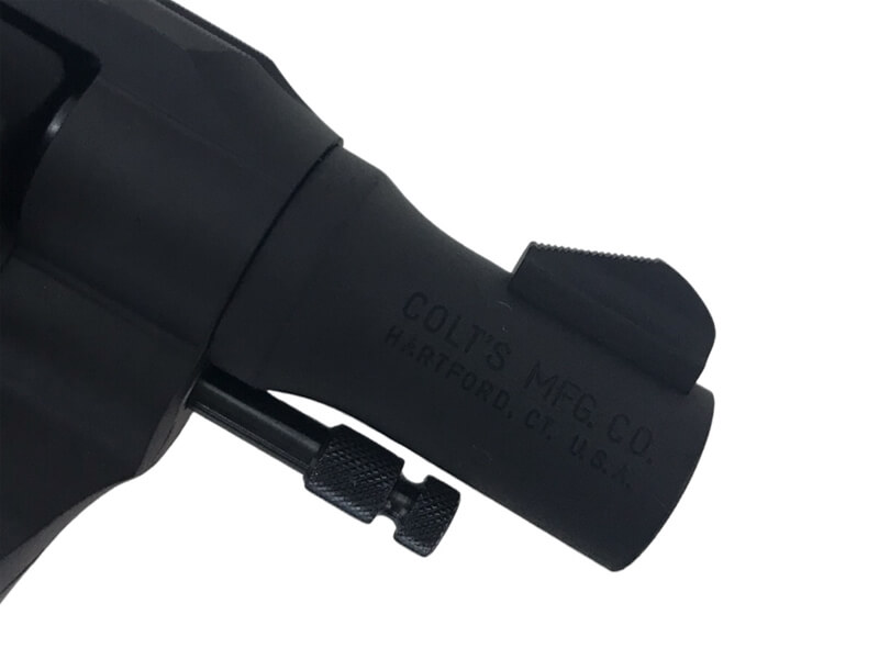 外観もフロントサイトやリアサイト部分の反射防止溝や、トリガーの滑り止めセレーションの追加のほか、世に出た1951年の初期モデルの特徴でもある、ベークライト調(ABS)グリップ、短いエジェクターロッド、サイドプレート中央に刻印されるランパントホース、バレルのCOBRA刻印を再現。
