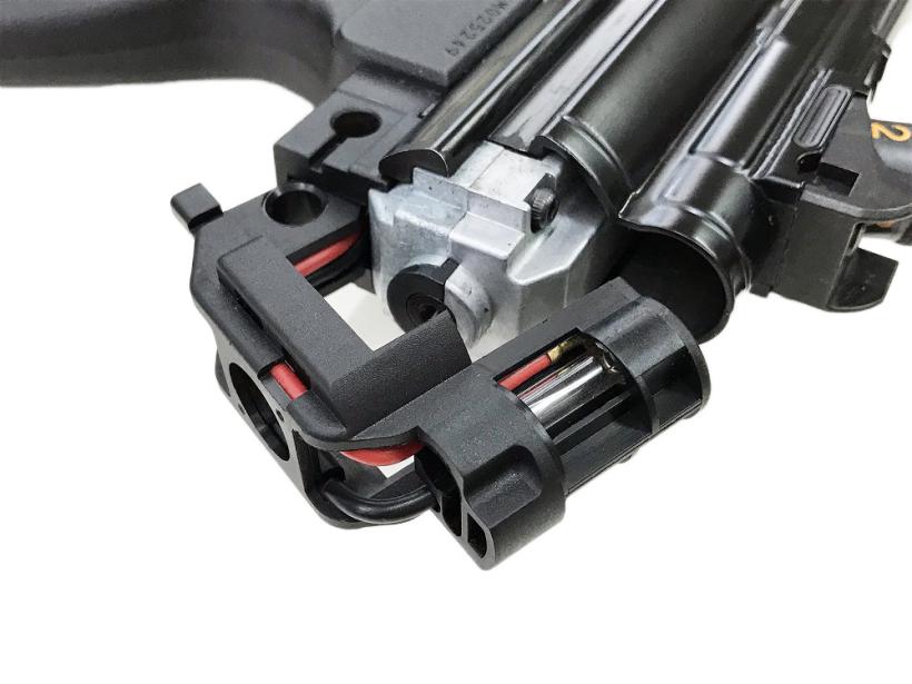 電動ガンはトリガーを引いてから、実際に弾が発射されるまでにタイムラグが起こる。トリガーが引かれてから初めて電気が流れピストンを動作させるためだ。33Kでは銃に不可欠なシアーを電動メカに導入したことで、引金を引いてからBB弾発射までの余分なタイムラグを解消している。また手動でコッキングしての発射が可能なのでバッテリー切れなどいざというときには役立つ。