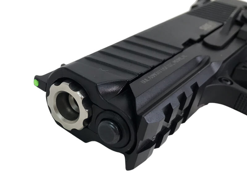 スライドの素材には、エアガンパーツとして一般的なABS樹脂よりも耐久性に優れる強化ナイロン樹脂を使用し、セレーションや刻印なども実銃を元にリアルに再現。