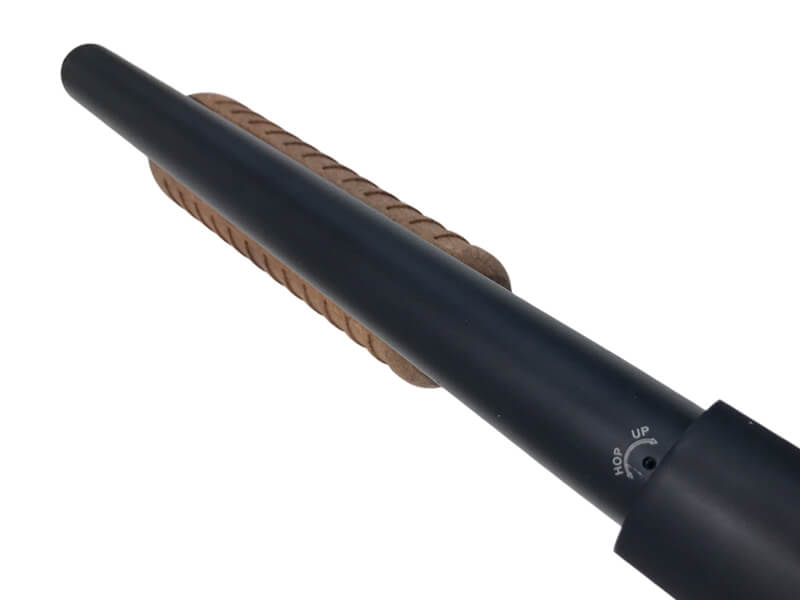 付属の六角レンチで右に回すとホップがかかりますが、HOPUPをかけすぎると弾詰まりを起こしますのでご注意ください。たま詰まりを起こした場合はマガジンを抜き、ホップを緩め発射の操作を行ってください。