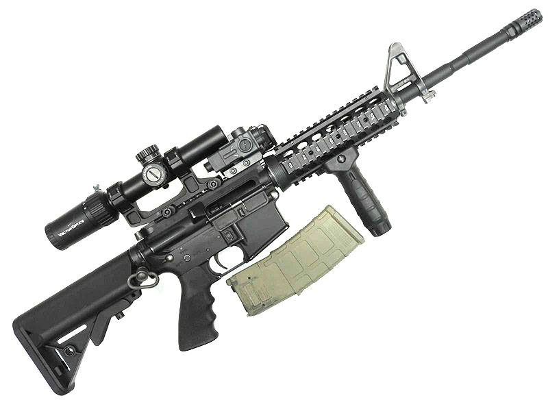 スコープ、エイミングデバイス、ライトにバーティカルフォアグリップも装備。