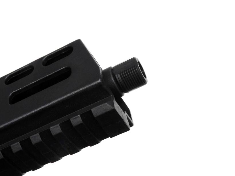 フルメタルの剛性の高いボディとショートなフロントは狭所での大きなアドバンテージになる。またフラットなトップレールは最大限活用できるので搭載するオプティックが幅広いのが特徴です。