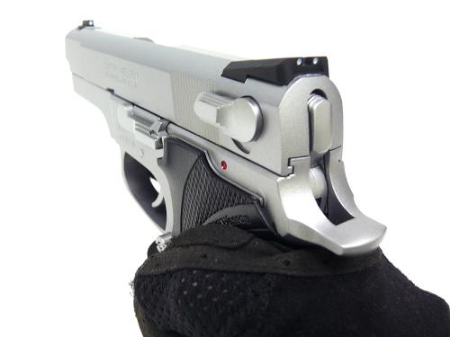 古くは固定スライドの「サイドキック」というモデルから、WAの古株ラインナップのひとつであるショーティ.40の最新版。前作のシルバーモデルと違いこちらはHWで製作されており、120gもの重量アップ。小型なキャリーガンなので数字以上の重みが感じられる。ワンピースグリップも特徴のひとつで、決して小さくはない.40S&W弾のダブルカラムであるにもかかわらず、恐ろしく握りやすい。手が少し小さくてもグリップしたまま無理せずマガジンキャッチを押せるだろう。動作もver.3となってハイスピードにブローバックし、決して強烈な衝撃というわけではないが、びしりと手首の骨までダイレクトに伝わってくるという感じがある。また、ハンマーコック時のトリガープルの軽さとフィーリングが素晴らしいモデルでもあり、本家S&Wとこれを再現したWAには賛辞を贈りたい。目の肥えたファンにこそ良さが分かる渋いモデルだ。