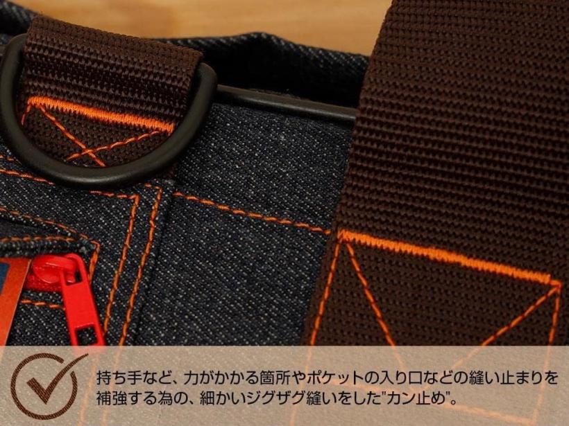 持ち手など、力がかかる箇所やポケットの入り口などの縫い止まりを補強する為の、細かいジグザグ縫いをしたカン止めを採用しています。