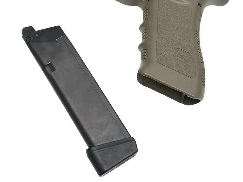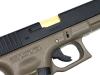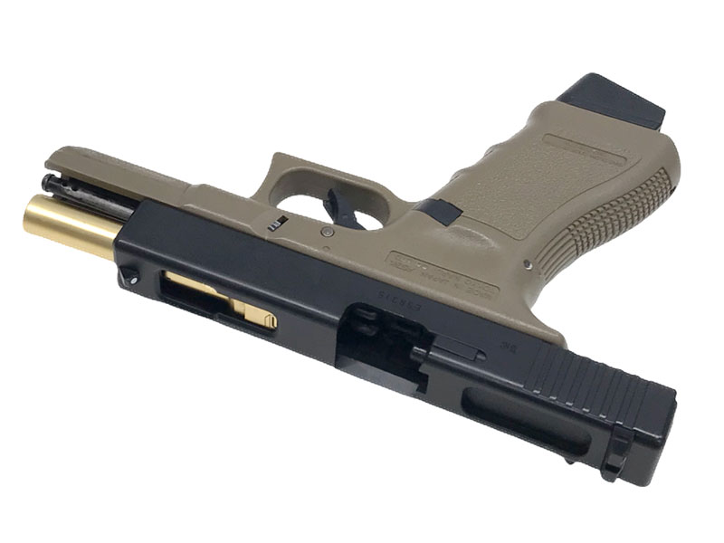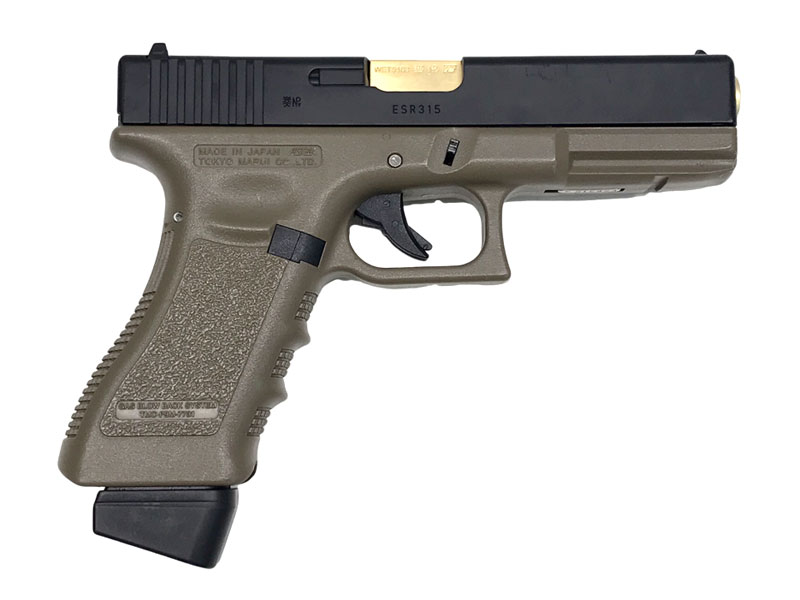 マルイ製グロック17カスタムFDEのフレームとグロック22タイプマガジンバンパー、WE製 SAIタイプゴールドバレル、などを組み込んだカスタム品!