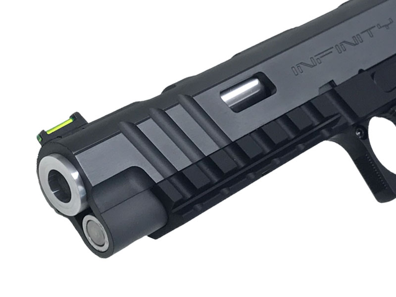 アルミ削り出しで製作された9mm仕様のアウターバレルが生み出す迫力のマズルフェイス。